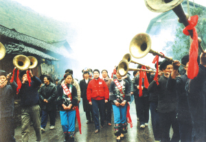 苗族姑娘們,穿鑲花邊衣褲,圍繡花抹裙,扎花絲頭巾,配銀飾花帶,可真叫艷麗。我們這些遠(yuǎn)道而來的游客受到熱烈的迎接,姑娘們用古樸的攔門對歌為我們洗塵。攔門地點(diǎn)是在村頭的小橋邊,姑娘們拉著一排民族織錦帶,滿面春風(fēng)地等待客人,兩邊苗鼓、獅子、嗩吶、甲馬長號夾道歡迎。儀式按苗族風(fēng)俗,由苗族姑娘們先唱熱情的迎客苗歌,再請客人唱歌作客,對歌三次方過攔門第一關(guān)。緊接著她們又捧出大碗苞谷酒向客人們一一敬酒。熱情好客的姑娘們一定要待客人喝了香醇的美酒后,才示攔門結(jié)束。然后,又一路鞭炮,一路號角吹吹打打,把我們請進(jìn)苗寨。
