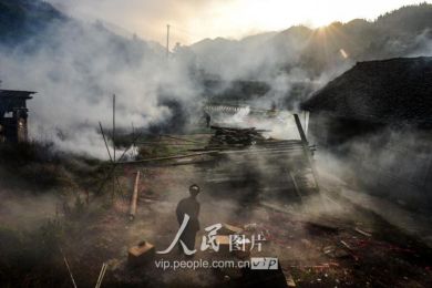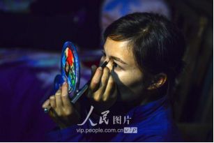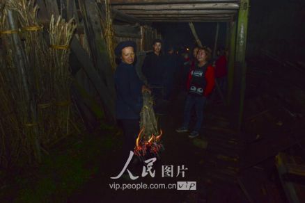 一般要到快過春節(jié)的時候,男方家才專門請人去接女方來洗糯米、打糍粑,新娘方能在夫家住上一夜;在來年農(nóng)忙時節(jié),又接女方來幫忙,夜里仍不能在男方家留宿,幫完忙當晚即回去,只有待到女方有身孕后,新娘才到夫家長住。圖為11月16日夜,新娘潘芝銀家為準備婚禮,燈火徹夜長明。