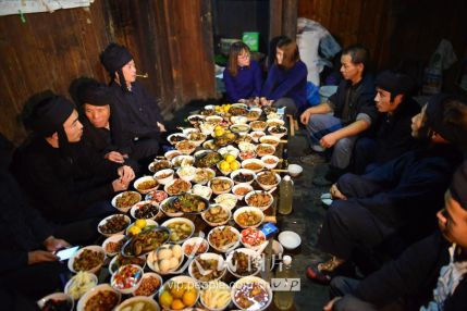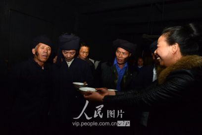 11月17日凌晨,新娘家的親戚在“發(fā)親”前與新郎家派來的“關親客”對歌敬酒。