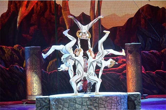 與以往傳統(tǒng)的雜技表演不同,雜技劇《巖石上的太陽》要求演員既要完成高難度技術(shù)動作,還要完成劇中人物角色的戲劇表演。劇目中利用多種藝術(shù)手段加之高、難、險、驚的雜技節(jié)目,讓觀眾在欣賞劇目的同時,能感受到一種強烈的文化氛圍以及巖畫帶給人們不朽的記憶。