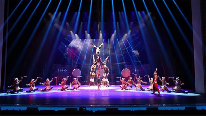 雜技是這部劇的一大亮點。新疆生產(chǎn)建設(shè)兵團雜技團近年來編創(chuàng)了《天鵝湖—男子倒立技巧》《向太陽—繩技》《春之韻—女子造型》等多個精品節(jié)目,并在國內(nèi)外重大雜技賽場多次獲獎?!稑翘m尋夢》中,主創(chuàng)團隊將這些獲獎節(jié)目進行拆解,將蹬鼓、獨輪車、吊環(huán)、肩上芭蕾、水流星及舞中幡等雜技技巧與戲劇元素相融合,讓觀眾猶如置身于黃沙漫漫的絲路古國。