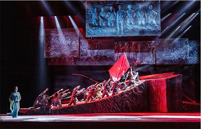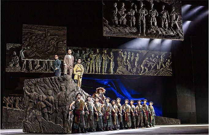 在舞蹈語言的設計上,編導融入當代元素,使觀眾不但感受到審美的親切與現(xiàn)代感,而且還自然地進入回望歷史的情境,對其思想內(nèi)涵的理解更為準確。該劇的道具使用和調度也頗為大氣,令人印象深刻。一組斜坡狀的大型舞臺道具不但由群眾演員直接移動而實現(xiàn)即時的場景調度,還可使演員上下和左右而行,最終組合成巨大的中國共產(chǎn)黨黨徽,輔助完成了人民英靈和英雄的形象塑造。