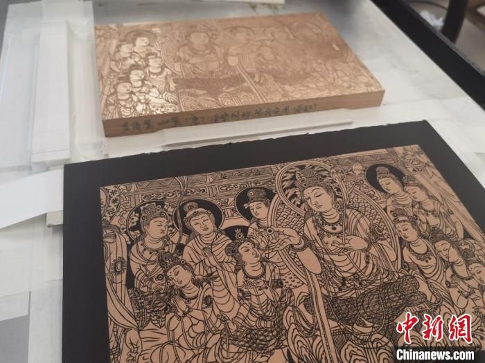 “將敦煌壁畫濃縮雕刻在木板上難度非常大,飛天裙裾要飄逸,菩薩的眉眼要有神,一刀都不能雕錯?!毙鞎x林最近剛完成以莫高窟444窟和57窟的壁畫為原型的雕版畫,目前累計完成上百件敦煌題材的雕版畫。