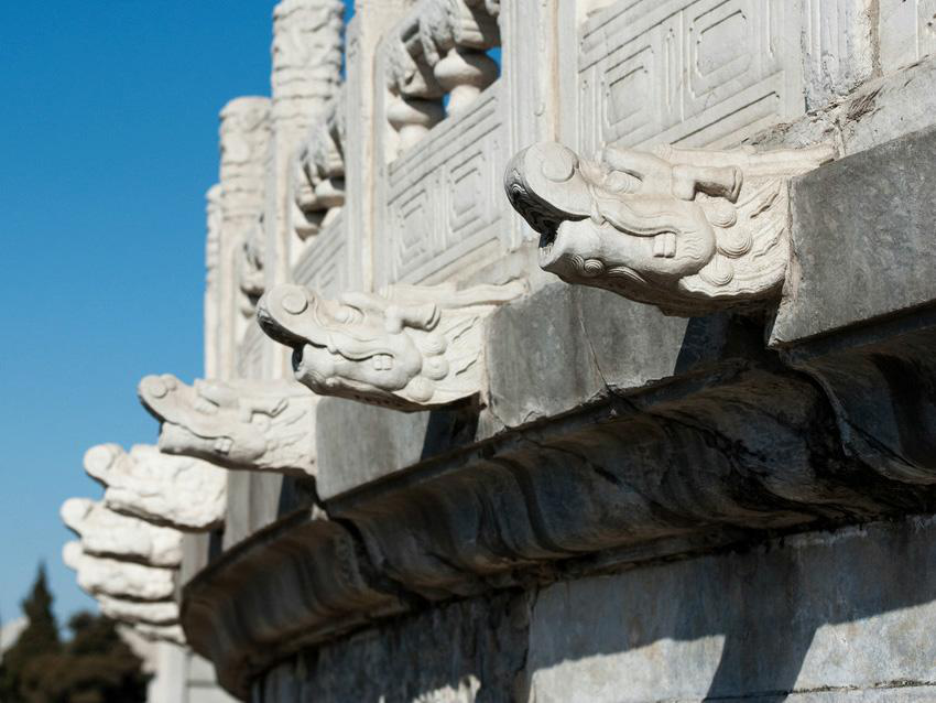 北京天壇祈年殿有三層月臺(tái),第一層月臺(tái)上的排水構(gòu)件是云頭,第二層的是鳳頭,第三層則是龍頭,這個(gè)龍頭就是螭首(chī shǒu)。同樣,故宮太和殿龍鳳云紋的望柱下就有排水螭首1142只,可以想見當(dāng)大雨滂沱之時(shí),螭首千龍吐水是何等壯觀的場面。
