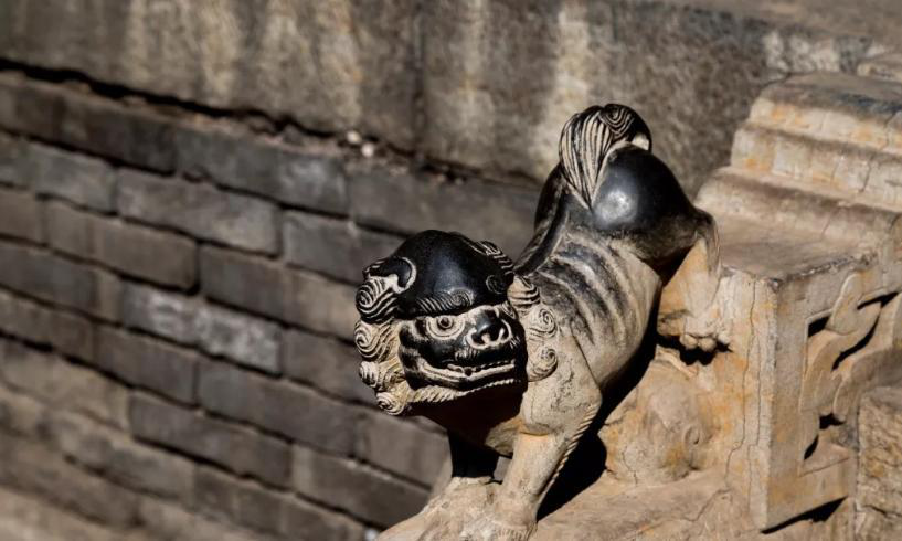石雕“麒麟送子”也是對家族人丁興旺的企盼。王家大院高家崖凝瑞居后院墻上的墻基石“麒麟送子”圖,祥云瑞氣繚繞著,捧出一條花草的道路,一只不吝雕工的麒麟活潑歡快地向前奔跑,他的身后是慈眉善目的老嫗形象。頭頂上還有一株大樹,上刻兩只小鳥,那就是“殷勤為探看”的青鳥吧,在這個時刻青鳥所關(guān)心的是小兒即將開始的人生旅程。