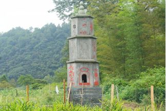這座完整的“惜字爐”位于易家田村巫水河西岸田垅邊,座北朝南,塔下河水潺潺,古木參天,景色宜人。全爐六角六面形,三層式格局,分為底層、亭座、亭身、云蓋、亭頂五部分。其中基礎(chǔ)層高105cm,主體第一層至第三層高度分別為120cm、105cm、88cm,頂層高70cm,連同3個云蓋在內(nèi)總高度達(dá)6米。“惜字爐”呈六面形,基礎(chǔ)層為正方形,四面各寬140cm;主體第一層至第三層每面寬度分別為70cm、60cm、50cm。頂層為3個寶葫蘆。