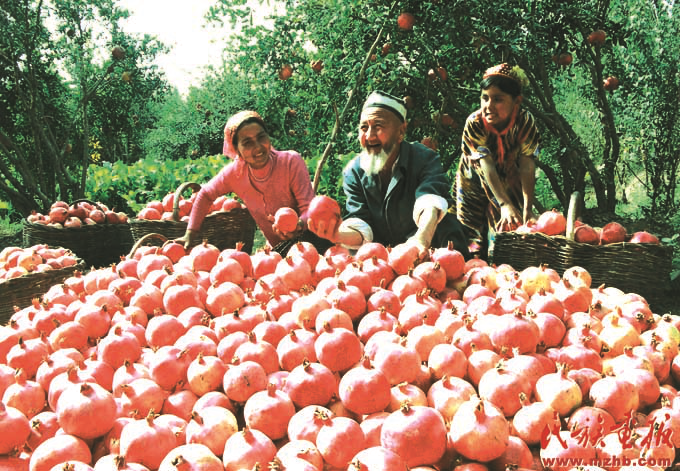 興邊富民行動是1999年中央民族工作會議部署的一項重要的邊境建設工程,旨在“富民、興邊、強國、睦鄰”。興邊富民行動為新疆的發(fā)展帶來了實惠,2006年,看著豐收的石榴,維吾爾族農民樂開了花?!睹褡瀹媹蟆?007年7期