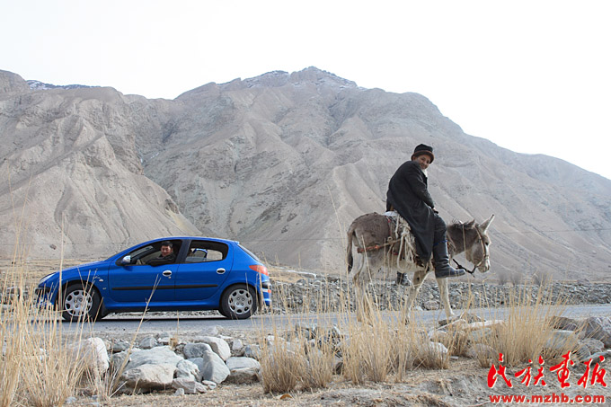 隨著一條條道路越過高山、穿過戈壁、連接綠洲、直抵大漠深處的村莊,汽車和摩托車成了民族地區(qū)各族群眾的主要交通工具,各族農牧民的出行條件得到根本改善。2007年,新疆維吾爾自治區(qū)開小轎車的年輕人與騎著毛驢的長者在路上邂逅。(中國民族圖片庫資料)