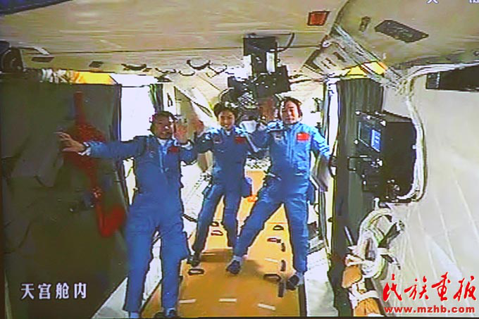 2012年6月18日,神舟九號飛船與天宮一號完成自動交會對接,兩飛行器形成穩(wěn)定運行的組合體后,三位航天員先后進入天宮一號目標飛行器,這實現(xiàn)了中國載人航天歷史上首次對一個在軌運行的航天器的拜訪和駐留。圖為在北京航天飛控中心大屏幕拍攝到的航天員景海鵬、劉旺、劉洋在天宮一號實驗艙內的畫面?!睹褡瀹媹蟆?012年第7期
