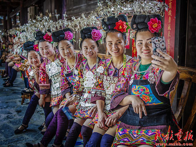 經歷改革開放40年的發(fā)展,我國社會生產力、綜合國力、人民生活水平實現(xiàn)了歷史性跨越,全黨全國各族人民要更加緊密地團結在以習近平同志為核心的黨中央周圍,高舉中國特色社會主義偉大旗幟,不忘初心,牢記使命,將改革開放進行到底,不斷實現(xiàn)人民對美好生活的向往,在新時代創(chuàng)造中華民族新的更大奇跡。圖為貴州民眾盛裝自拍?!睹褡瀹媹蟆?018年第3期
