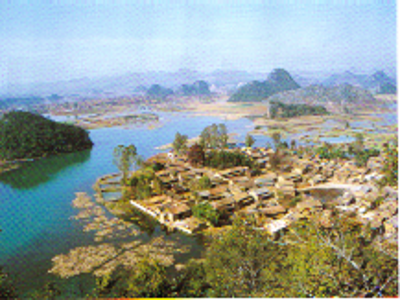 在一次學術會議上,筆者請教了首倡并主導“民族文化生態(tài)村”試點建設的尹紹亭教授,得知在他們首期的五個試點村落建設中,仙人洞村是比較成功的,于是在本項目的調查中,仙人洞村成為重點考察的對象之一。“仙人洞彝族文化生態(tài)村”位于云南丘北縣城西北16公里的普者黑湖畔?!捌照吆凇睘楫?shù)匾妥迦瞿嵴Z,意為“魚蝦多的湖潭”。普者黑實際是由眾多湖泊、河流構成,總面積達165平方公里,已經(jīng)開發(fā)成由5個景區(qū)、56個景點組成的滇東南國家級著名旅游景區(qū)。