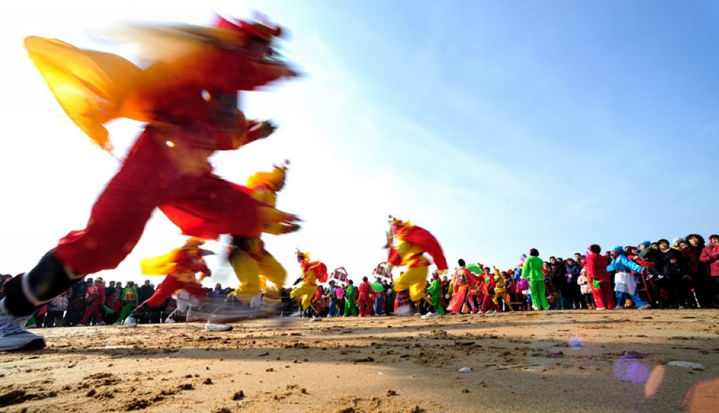 秧歌是春節(jié)群眾歡慶活動中,起著承前啟后、烘托氣氛的大型歌舞形式。這里所指的“秧歌”不僅是單一的“秧歌舞”,而是包含著數(shù)十種歌舞形式所組合的文藝演出隊伍。這支隊伍既要在走街串巷中做行進(jìn)表演,又將最后集中于廣場做正式的歌舞演出。因此在北方,人們索性就把過去有著祭祀色彩,而今完全成為春節(jié)娛樂式的民間文藝形式稱為“社火”或“秧歌”,把這支浩蕩的隊伍統(tǒng)稱為“秧歌隊”。秧歌隊最前方,在高舉象征來年風(fēng)調(diào)雨順大傘的藝人率領(lǐng)下,“龍舞”“獅舞”舞隊位列隊首;接下來是一組手揮彩綢翩翩起舞,走“雙葫蘆”“繞菠花”各種圖案的“大場”表演隊;然后是腰間橫挎紅色腰鼓、踏著激越鼓聲的“腰鼓隊”,表演著令人眼花繚亂的“回頭望月”等套路;再后面是腰系竹馬或旱船,扮演新郎送媳婦回娘家的“跑驢”或“跑旱船”;接著是腳踩丈八高蹺、穿戲裝、彩繪臉譜的“高蹺隊”。接下來還有名為《火盆架子》的隊伍,那是把冬季用于取暖的炭盆架,用繩子將其高于腳面懸掛在肩上。盆架以綢布、花草裝飾,表演者戲裝打扮,表演一段段膾炙人口的戲曲節(jié)目。他們被歡天喜地、熙熙攘攘的人們擁簇著一同前往最后進(jìn)行表演的廣場。由各個村鎮(zhèn)陸續(xù)舉行的這種熱烈而歡騰的歌舞慶祝形式,將貫穿在整個春節(jié)期間,直到正月十五“燈節(jié)”。