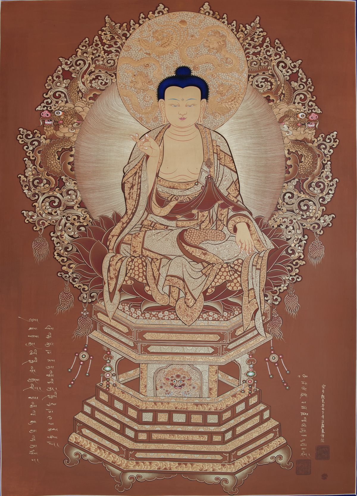 大日如來佛,又名比盧遮那佛,是佛的三身中的法身佛,是密宗最無上崇高的佛,是一切佛法的根本。亦是五方佛中的中方比盧遮那佛,居于世界中央位置。