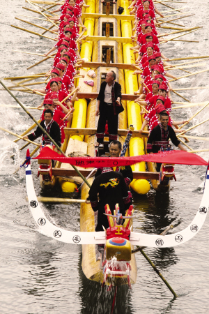 “苗族第一龍舟”全長77.8米,寬2.5米,整舟由一條主舟與兩條子舟組合而成,主舟居中,子舟為輔船,組裝在主舟左右兩側(cè),兩條子舟分別長58米。整船可承載槳手160人,舵手、鼓手、鑼手等共20人,總計180人。
