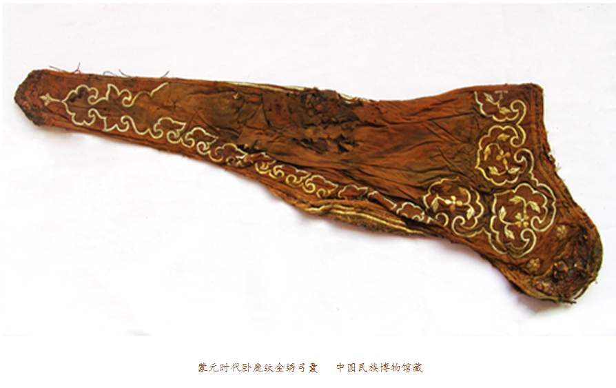 我們曾經(jīng)描述過元代納石失生產(chǎn)的空前絕后。蒙古民族把對于黃金的寶愛,傾泄進元朝一百年的歷史時空。在整個13世紀的每一個歷史篇章,都鐫刻著納石失的金縷光影。我們在史料里看到,天子之衣是納石失,天子之裳是納石失,天子之履依然是納石失。那么,蒙元一代,還有什么是用黃金絲線耗盡心血織繡而成的呢?現(xiàn)在,我們看到了這只金繡弓囊。