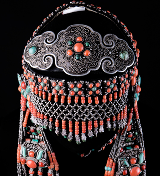 頭箍飾:是整個頭箍是頭飾的中心骨架,也是頭飾的中心飾件,飾于頭圍,呈圓扁形環(huán)狀飾帶, 多以青色綢緞布打成袼褙后剪制成底襯, 與頭圍周長相吻合。在其表面以綢面貼飾,再依個人愛好在頭箍外緣表面上, 釘綴銀托。銀托可分三種:其一為圓形鏨花掐絲云紋銀托,其銀鏨花中間為圓形環(huán)飾, 間鑲嵌呈半圓體形紅色珊瑚珠,由白色銀鏨托飾托起, 釘綴在青色綢箍之上, 青、白、紅相映, 艷麗無比;其二在銀鏨托花飾正中,有一個較大的銀鏨托花正好飾在額前雙眉之上,呈桃形銀鏨托花,上鑲嵌半圓體形珊瑚珠,并在珊瑚珠周圍鑲嵌葉片形綠松石珠,從整體造型來看似一串水晶般紅綠葡萄在額前閃耀, 十分華麗;其三在前額頭箍處, 于半圓形浮雕式的銀鏨花托間隔金剛杵形銀托座, 在托坐之上鑲嵌長圓柱形的珊瑚珠, 美觀莊嚴, 具有宗教含義。