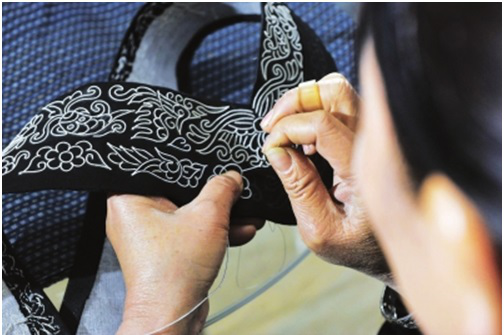 第四步是刺繡,包括三個(gè)環(huán)節(jié),即固定框架圖案、填芯和鑲邊。固定框架圖案,即用一根大針將馬尾線穿好,再用另一根稍小的針穿上同色絲線,然后一邊用馬尾線在布面上鑲成各種圖案,一邊用穿有絲線的小針將圖案固定在布面上。填芯,即用各色絲線將固定好的圖案空隙部分填滿。鑲邊,即用橙色和黑綠色絲線在四周挑繡成鑲邊圖案。