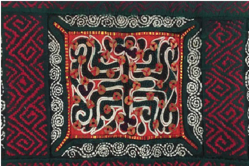 背兒帶上端的背帶手上繡有連續(xù)的螺絲紋。水族是南方的稻作民族,而螺螄是水田中常見的動(dòng)物,其繁殖屬性為多產(chǎn)。心靈手巧的水族女性將日常生活中的動(dòng)物形象,經(jīng)抽象變形而變成簡練的紋樣,象征著生命的不斷繁衍。