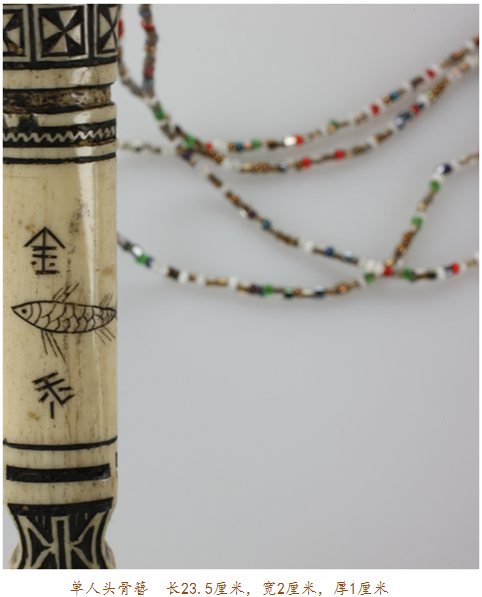 骨簪頭部以下是充滿幾何感的水波紋、山形紋、米字紋、圓形紋,留白之處有魚(yú)紋、花紋以及少許文字。文字或是雕刻者本人,或是其心愛(ài)之人。一般頭像處或中部系有幾束彩色料珠的紅纓穗飾物用以盤繞發(fā)髻上,或是以銀鈴、銀片來(lái)裝飾。