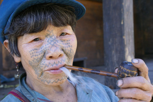來自獨(dú)龍江上游的二鄉(xiāng)、一鄉(xiāng)的婦女則從額頭起,面紋布滿了整個(gè)臉部,僅僅是花紋圖案不一樣。有些老年婦女不但滿面紋,連頭發(fā)也剃光,只剩額前小小的一撮。據(jù)說,從不同的面紋圖案,當(dāng)?shù)厝艘谎劬湍芸闯鲞@個(gè)婦女居住的地方,是某個(gè)部落或民族的。