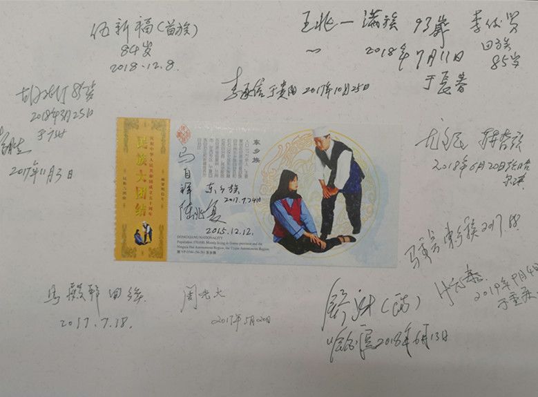 在采集口述影像錄音資料的同時(shí),項(xiàng)目組還收集了大量的珍貴歷史照片以及相關(guān)文物。值得一提的是,他們設(shè)計(jì)了一種非常有特色的受訪者簽名簿,中間貼著繪有56個(gè)民族的音樂舞蹈圖案的首日封或明信片,四周簽上受訪者的人名簽名字、民族特征,有些還用民族文字書寫,體現(xiàn)了中華各民族團(tuán)結(jié)在一起的精神風(fēng)貌。簽名簿有厚厚的幾大本,設(shè)計(jì)精美,承載著民族工作口述史資源采集的經(jīng)歷,具有豐富的文化內(nèi)涵和博物館收藏價(jià)值。