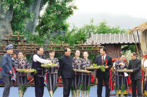 黔西南州領(lǐng)導(dǎo)和望謨縣委書(shū)記鄧家富(右三)、縣長(zhǎng)黃興文(前排左三)為望謨縣各族人民和各位來(lái)賓祈福,播撒幸福種