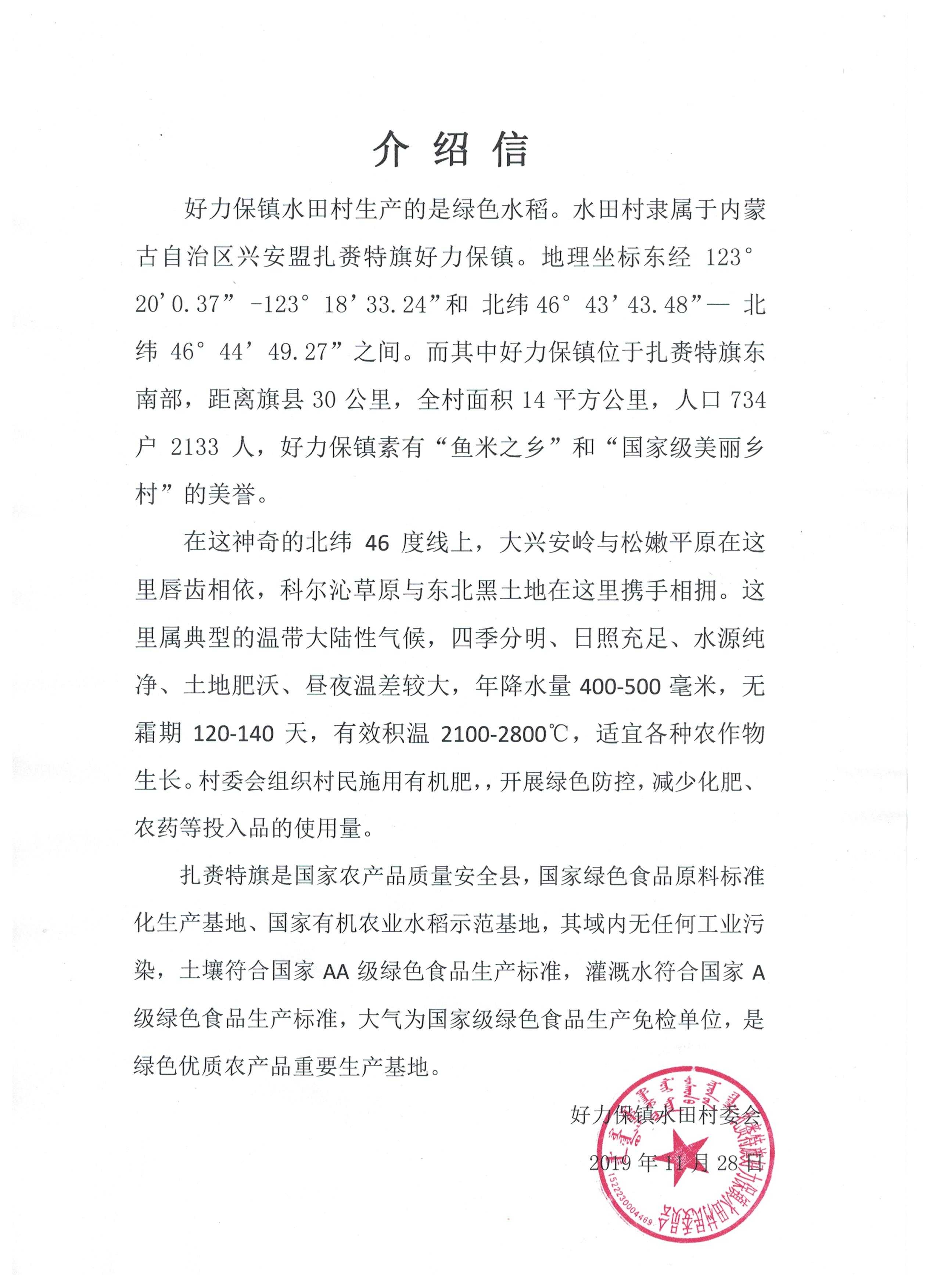 蒙古屯村屬好力保鎮(zhèn),沿綽爾河岸而建,水田較多,祖輩種植水稻。蒙古屯村的土壤以黑土為主、土質肥沃,全年積溫在2600到2700攝氏度左右、并且早晚溫差較大,有利于水稻中有機物的積累。綽爾河水充足時,可以滿足沿岸灌溉需求;河水流量較少時,蒙古屯村自有的機井也可以滿足種植所需的水量。