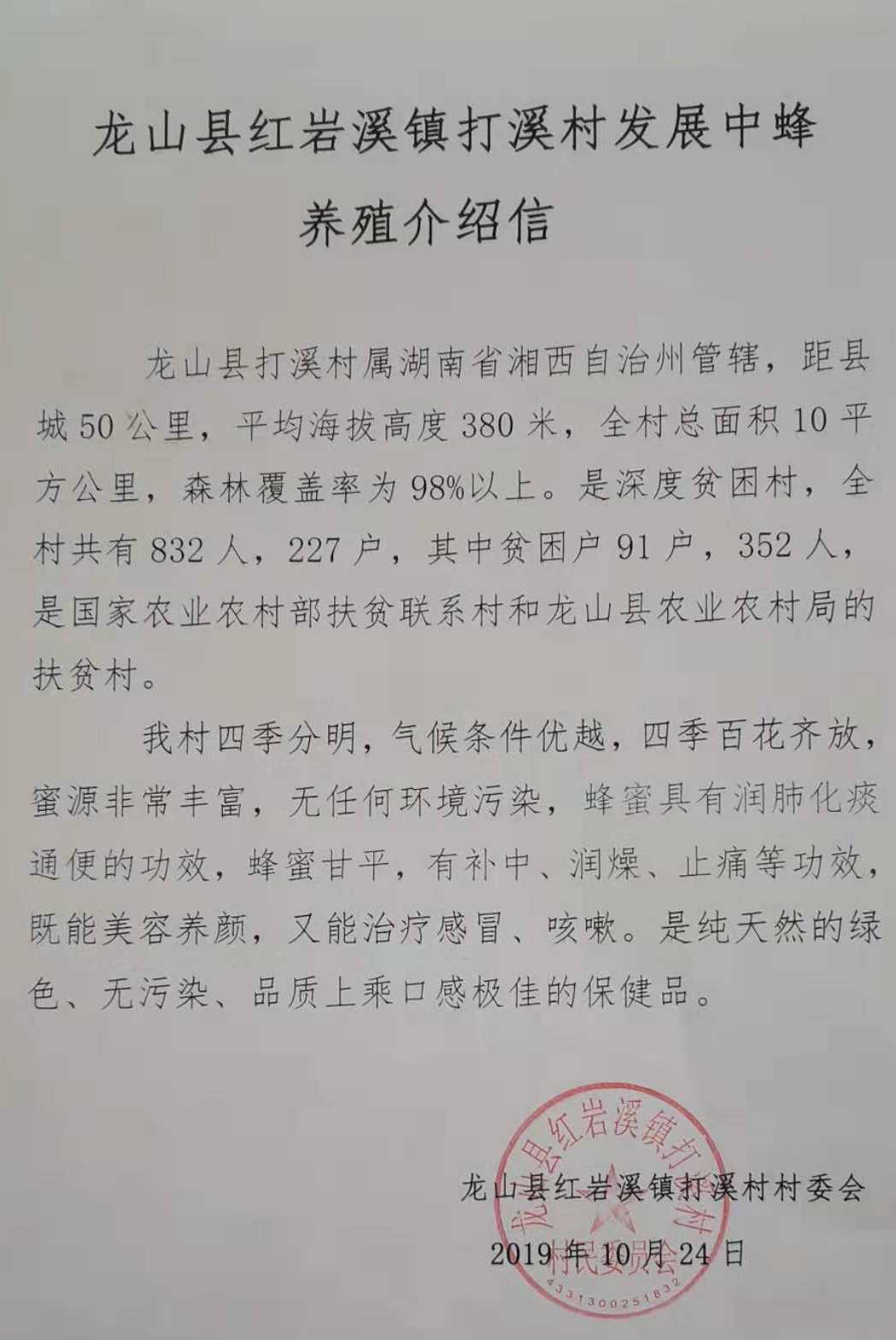 這里四季分明,氣候條件優(yōu)越,四季百花齊放,蜜源非常豐富,無任何環(huán)境污染。據(jù)湖南省湘西州龍山縣紅巖溪打溪村支部書記沈世平介紹:“我們這兒已經(jīng)有很長的養(yǎng)殖蜜蜂的歷史,環(huán)境無污染,田土少,屬于純天然養(yǎng)殖,無農(nóng)藥,利于中蜂的養(yǎng)殖,并且在2019年4月份的時(shí)候,通過農(nóng)業(yè)部及農(nóng)業(yè)科學(xué)院的專家實(shí)地考察,認(rèn)證為最佳養(yǎng)蜂環(huán)境。今年獲得鄉(xiāng)政府幫扶,規(guī)劃從龍山縣中心養(yǎng)殖合作社引進(jìn)50箱進(jìn)行集中養(yǎng)殖,明年開始分設(shè)4點(diǎn),一個(gè)點(diǎn)150箱,擴(kuò)大產(chǎn)量,并向全縣推廣?!?/p>