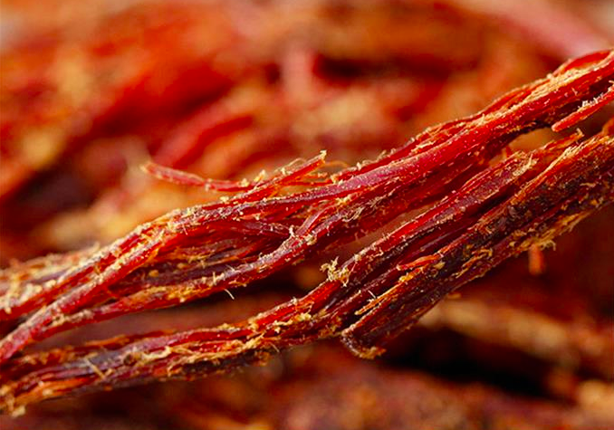 5、捶:將刮干凈的干巴置于砧板,用特制的木捶四周捶,用力要猛,要準,同時要注意安全,捶數(shù)下,待干巴的呈細絲狀,取出。