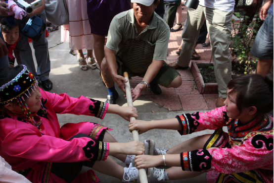 鄂倫春族特別喜歡體育活動,每當(dāng)狩獵閑暇的時候,便會開展各項體育比賽活動。兩三個人在一塊平地上,拿出一根皮繩就可以進行跳繩比賽;在河邊撿起石頭就可以進行投擲比賽;跳到河里又可以進行游泳比賽。他們也很樂于進行力的較量,摔跤,鄂倫春語稱“娟滴任”,這是獵人們普遍喜愛的一項運動,常勝者會贏得人們的贊賞和姑娘的青睞。還有一種較力比賽,鄂倫春語稱“譚滴任”,俗稱“拽棍”。兩人相對坐在地上,雙手緊握一根約半米長的木棍,雙腳平伸雙足相抵。比賽開始,雙方拼力拽拉木棍,將對方拉起來為勝。