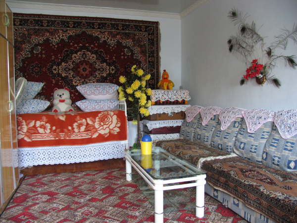 木刻楞房的室內(nèi)結構一般有客廳、臥室、廚房和儲藏室四部分構成,房屋的整體結構呈四方形,建造有傾斜度較高的屋頂,利于雨雪不會覆蓋在屋頂,從而造成屋頂承重過高而發(fā)生坍塌。此外,俄羅斯族人一般都會選用紅色、藍色或者綠色的鐵皮將屋頂精心包裹一番。這不僅可以起到很好的防風御寒、防止雨雪滴漏進室內(nèi)的效果,而且也使木刻楞房色彩十分和諧艷麗。房屋的正門之前一般會建造寬闊的門庭和圍廊,門內(nèi)有過道,過道兩旁是臥室和客廳。室內(nèi)的墻角有土坯壘砌的火墻。有的人家是大型壁爐,外包一層鐵皮,鐵皮上抹一層黑油,俗稱“毛爐”,是很好的取暖設備。室內(nèi)陳設比較講究,臥室擺放著木床或鐵床,鐵床欄桿雕有花草圖像,給人以古雅之感。木刻楞房室內(nèi)一般會在地面鋪上木地板,俄羅斯族人們也十分喜愛在家中鋪設飾有各類花紋圖案的地毯。