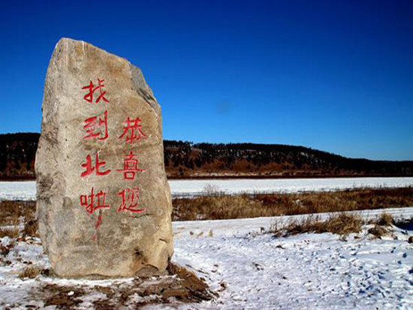 沿著形態(tài)各異的“北”字,可以走到中國最北端的廣場——北望埡口。“東經(jīng)122°20'43。48〃E北緯53°29'52。28〃N”的標(biāo)志就立在這里,旁邊一塊巨石上刻著“中國北極點(diǎn)”。