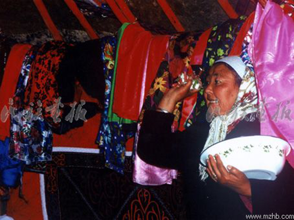 新婚喜宴開始的時候,客人先按照哈薩克人的習慣洗手,用主人準備的毛巾擦手,然后,按年齡的長幼圍坐在地氈上。主人把油炸的包爾沙克,香噴噴的手扒肉,色、香、味俱全的抓飯一盆接一盆地端來。吃完這些,大盆的肉湯或馬奶端到客人面前。哈薩克人對馬奶有著特殊的感情,他們喝完一碗又一碗,興高采烈,眉飛色舞。