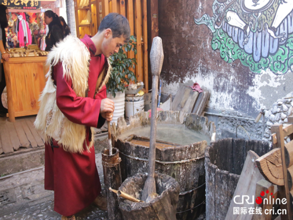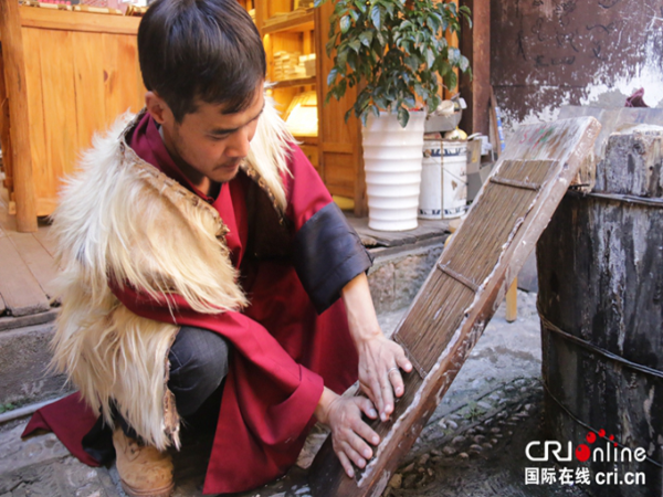 納西族男子楊慧杰展示東巴紙的造紙過程