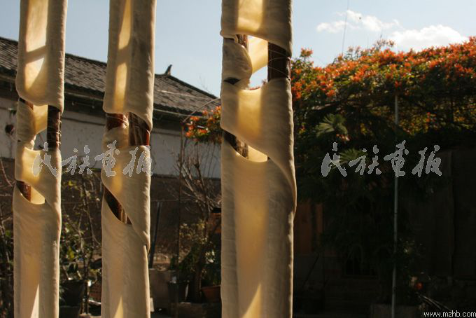 冬日里的一個午后,我來到蝴蝶泉邊的周城村,在一戶白族人家里探訪了乳扇的制作過程。剛到大門口,就聞到一股淡 淡的乳香。走進院子,只見一位白族婦女正舉著一根長長的桿子往老高老高的鐵絲上掛,院子里掛滿了一排排白花花的像是裹著白布的竹桿。走近一看,桿子上白白的東西并不是白布,向?qū)Ц嬖V我,這就是乳扇。