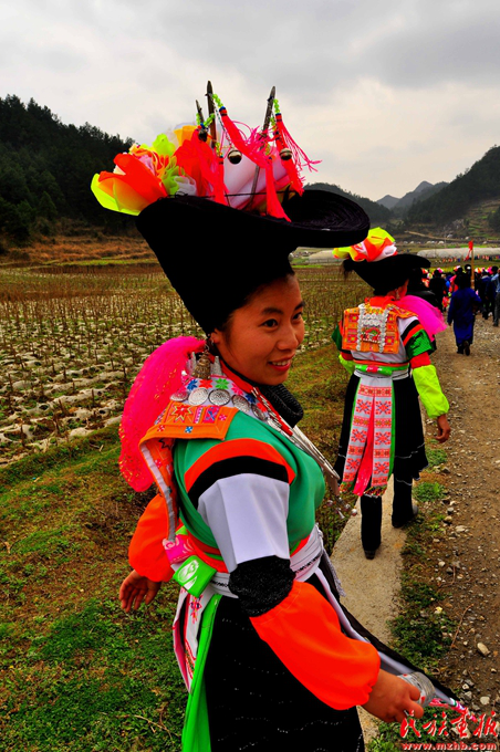 跳洞還有一項(xiàng)職能就是聯(lián)誼。正月期間,遠(yuǎn)近的苗家人都聚集在一個(gè)個(gè)有“洞”的村寨,一個(gè)“洞”跳一天舞,親戚朋友之間也借機(jī)聯(lián)絡(luò)感情。而對(duì)于苗族青年男女來(lái)說(shuō),“跳洞”則是一個(gè)相親的好機(jī)會(huì),通過(guò)跳洞相識(shí)、熟悉、相戀、成婚……杉坪村的家庭基本都是由跳洞開(kāi)始而后組成的。