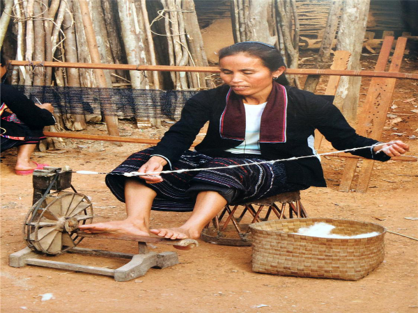“紡”是把野生棉花或木棉花用絞棉機(jī)去除棉籽后捻成線,纏繞到手捻紡輪車上,包括錯(cuò)紗、配色、綜線、攀花等。