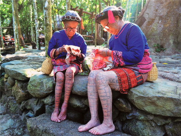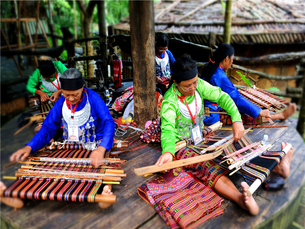 “織”是指使用踞腰織機(jī),采用通經(jīng)斷緯的紡織方法織出各種花紋圖案,在織布時(shí),先手工掛經(jīng),綁住藤或樹皮布腰帶,用腳踩織機(jī)的經(jīng)線木棍,席地而坐織布??椈ㄊ怯煤谏蛩{(lán)黑色做底線(經(jīng)線),根據(jù)圖案需要,將各種染色的線搭配,拉經(jīng)線、投緯線(彩色線),用木刀打緊緯線,織出各種花紋圖案。