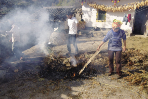 彝家人褪豬毛的方式比較獨特,不使用開水沖燙,而是把豬放在草堆上用火燒,然后再用刀刮去豬毛。草堆被點燃后,豬肉的香氣便彌漫在空氣里。