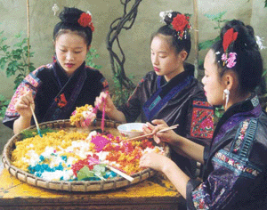 最有特色的要數(shù)客人進(jìn)寨時(shí)特殊的迎賓儀式——“攔路酒”了。侗家人在進(jìn)入寨子的在門樓邊設(shè)置“路障”,擋住客人,飲酒對(duì)歌,你唱我答,其歌詞詼諧逗趣,令人捧腹,唱好了喝好了,再撤除障礙物,恭迎客人進(jìn)門。入座后又是換酒“交杯”,鄰居或自動(dòng)前來陪客,或?qū)⒖腿苏?qǐng)到自己家中,或“湊份子”在鼓樓中共同宴請(qǐng),不分彼此。酒席上還有“雞頭獻(xiàn)客”、“油茶待客”、“酸菜苦酒待客”、“吃合攏飯”、“喝轉(zhuǎn)轉(zhuǎn)酒”等規(guī)矩,歡中有禮.文質(zhì)彬彬。清人詩云:“吹徹蘆笙歲又終,鼓樓圍坐話年豐。酸魚糯飯常留客,染齒無勞借箸功?!闭嵌闭瘹g宴賓客生動(dòng)情景的寫照。