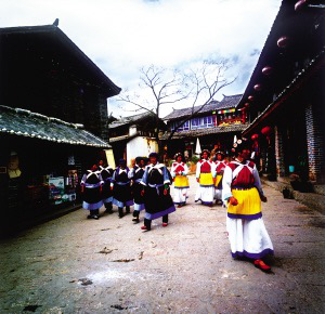 束河、沙河古村鎮(zhèn)到處都是納西族的田園式庭院。大門的裝飾與圍墻和屋脊的裝飾相呼應(yīng),庭院里種了許多植物,高的果樹,矮的花草,就像一個(gè)小花園,和田間彌漫著的野薔薇都散發(fā)著令人陶醉的幽香。