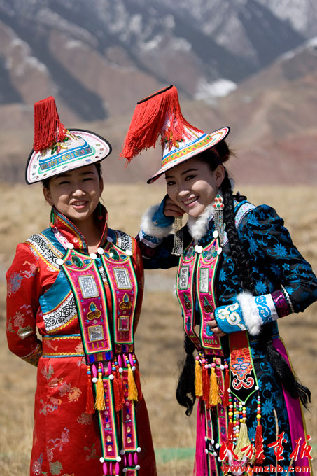 帽子是姑娘和已婚婦女的區(qū)別標志。姑娘不戴帽子,前額戴“沙日達什戈”。這是一條寬約三寸長約一尺,下邊緣用紅色或白色珊瑚小珠穿縫許多珠穗的紅色布帶。已婚婦女身穿高領(lǐng)偏襟長袍,一般由綢、緞、布、褐、皮料縫制。衣領(lǐng)高齊耳根,袍子一般以綠、藍色為主,但也有深紅、紫紅等顏色。袍子下擺兩邊開衩,衣袖口至肘部用各色織錦緞、彩綢、彩緞花邊一圈圈縫綴裝飾。腰系腰帶(裕固族也叫“胡兒”,即系腰),主要是桃紅色或綠色,長袍上面罩一件高領(lǐng)偏襟坎肩,但也有無領(lǐng)偏襟坎肩。