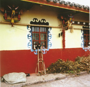 四川昭覺彝民民居獨有的牛頭裝飾。最能展現(xiàn)彝族建筑特色的要數(shù)前屋檐的挑拱了。屋檐的裝飾在建房時從墻上穿枋垂柱形成,少則3層,多則5層,上層垂柱上雕成牛角形托起屋檐的橫梁,下層垂柱上雕有形象逼真的裝飾牛角,垂柱的卡槽為牛蹄形、馬牙形,蹄尖向內(nèi),以示招財進(jìn)寶。穿枋向上彎曲,與垂柱的牛蹄呼應(yīng),傳統(tǒng)的穿枋雕刻日月星辰、飛禽走獸和條形圖案。