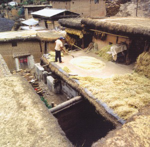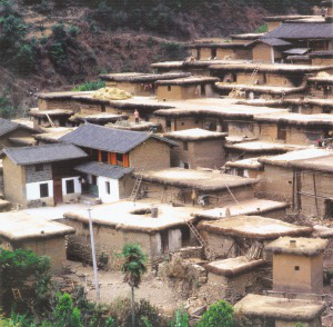 土掌房屋頂 云南楚雄地區(qū)的土掌房,是土墻、土頂、外墻和底層無窗的兩層樓房。有的內(nèi)院也蓋屋頂,稱“無內(nèi)院式”。設(shè)天窗采光,屋頂還能當(dāng)曬臺。整個村落沿山坡而建,巷道很窄,遠(yuǎn)遠(yuǎn)望去,你家的屋頂是他家的院壩,只要上了一家屋頂,就能靠活動的木梯自由往來。