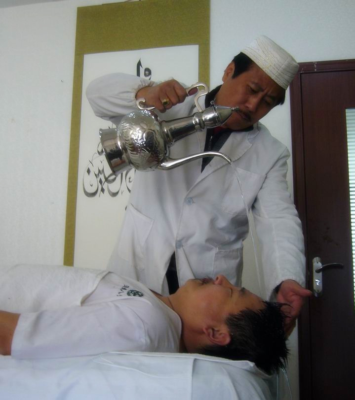 湯瓶八診療法,包括頭診、耳診、面診、手診、腳診、骨診、脈診、氣診八種療法,與現(xiàn)代經(jīng)絡學有相同的哲學思想。因人而異,運用不同的經(jīng)脈、竅穴診療。它主要是依據(jù)回族醫(yī)學基本理論,運用湯瓶水浴、末稍經(jīng)絡根傳法、放血、刮痧、火罐等湯瓶的基本手法,并結合穆斯林視為神圣的“杜阿伊”,分別作用于受施者身體的不同部位,操作者通過受施者的各種反應,即可判斷疾病之所在,進而調(diào)整施術的治療手法、輕重程度和次序頻率等,從而使受施者達到提高免疫機能、防病治病的目的。
