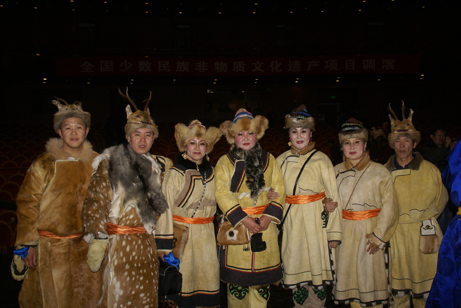 鄂倫春族的傳統(tǒng)服裝以袍式為主,冬季穿“蘇恩”。“蘇恩”是用冬季絨毛狍皮縫制的右任長(zhǎng)袍,小立領(lǐng),襟邊、下擺和袖口用黑色皮鑲嵌云卷花紋等邊飾,女袍還要作環(huán)肩裝飾。為便于奔跑和騎馬,“蘇恩”都有開衩,衩口裝飾圖案豐富多彩。夏天穿用夏季沙毛狍皮制作的短袍或坎肩,布匹傳入以后穿布袍。 男子下身穿狍皮短褲,褲腿過(guò)膝,樣式如老式免襠褲,后來(lái)改穿長(zhǎng)褲。出獵時(shí)褲子上面還要穿套褲。套褲無(wú)襠,呈筒狀,上角釘有皮條,系在腰帶上。一般用夏季的狍皮縫制,因?yàn)橄募镜尼笃ぐ搴衲湍?,也有用鹿皮縫制的。婦女的褲子樣式比較獨(dú)特,長(zhǎng)至腳面,比男褲瘦些,腰兩側(cè)有開衩,前面有兜肚,兜肚頂端釘皮條,系在脖子上。這樣的褲子,既保暖又便于騎馬,可以護(hù)住前心,又起到了乳罩的作用。講究的人還在褲子兩側(cè)和褲腳處繡上花邊圖案。
