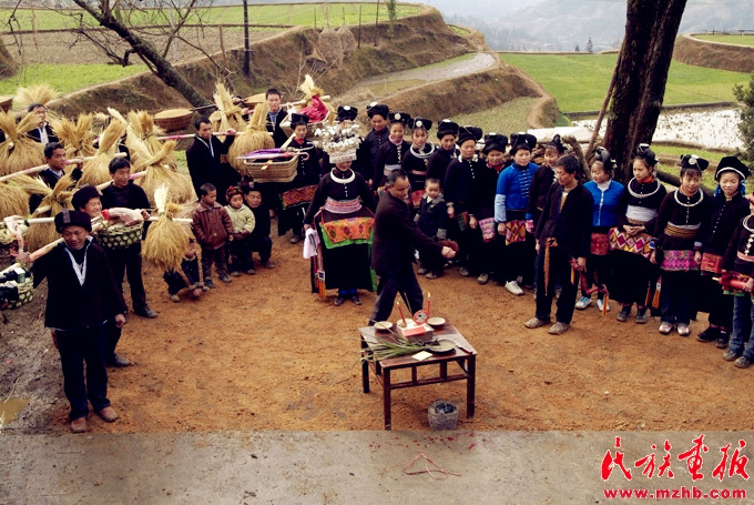 苗族送親隊(duì)伍來到新郎家的寨口,寨老為新娘主持“回喜神”儀式。楊昌垠,引自民族畫報
