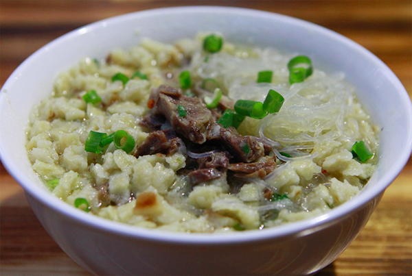 饃掰好后,請(qǐng)伙計(jì)呈給掌勺大廚,加羊肉湯大火快煮,加牛羊肉、粉絲、蔥花、蒜苗、香菜,優(yōu)質(zhì)的還有木耳、黃花菜和香干等即可端上來吃了。這樣一大碗自己親手掰好的泡饃,翠綠的蔥花、蒜苗、香菜、紅褐色的牛羊肉、黃色的金針菜、映襯著潔白晶瑩的粉絲、黝黑的木耳、香味四溢,。還應(yīng)注意的是:端上來的泡饃應(yīng)是泡饃墊底,粉絲覆成網(wǎng)形,佐以蔥花、香菜、牛羊肉擺成魚形在最上面,吃時(shí)左手拿勺,右手執(zhí)筷。泡饃上桌后,把辣子醬鋪在上面,切忌攪動(dòng),講究從一邊“蠶食”,以保持鮮味。糖蒜用否,個(gè)人自愿。餐后飲用一小碗原汁烹制而成的高湯,以為清口。