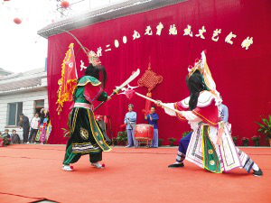 在花溪區(qū)的地戲中,最有影響力的是大寨地戲隊,除天時地利人和外,他們的演出技巧高于其他戲班,湖潮新民、黨武下壩和燕樓思惹三個地戲隊次之,其他隊則各有所長,他們的演出同樣受到當(dāng)?shù)厝说臍g迎?;ㄏ獏^(qū)的地戲演唱,只用一面大鼓和一只銅鑼打節(jié)奏即可。布依族地戲充滿陽剛之氣,雖然地戲的唱詞本地人也很難聽懂,但只有在那山那鄉(xiāng)才能有那樣的體驗,讓你頓生一種鄉(xiāng)土的莊重的歷史感。