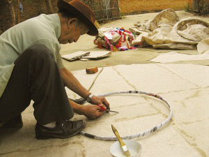 言談間,巖妞把制好的竹環(huán)放入早已畫好的同心圓圖案中的小圓上,只見竹環(huán)大小正好與小圓吻合。巖妞說,圖案外側(cè)的大圓便是擺放棉紙用的。接著,他把手中厚厚的幾張棉紙圍繞著已經(jīng)放入圖案中的竹環(huán)依次擺入,直至擺滿。在同心圓圖案的上側(cè),巖妞還畫了一個(gè)寬與同心圓圖案的直徑相符的矩形圖案,把棉紙鋪滿其中。巖妞說,這圖形就是“貢菲”的高度。制作的最后一道程序,是把棉紙用漿糊粘合起來。陰干后,一個(gè)“貢菲”就做好了。